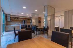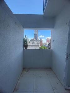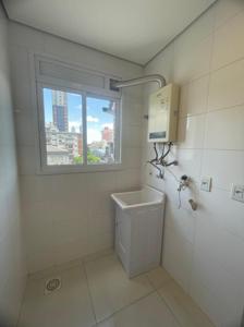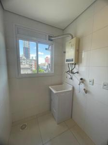 A sacada é fechada e tem um bom espaço, com uma mesa alta e churrasqueira com exaustor para comer um churrasco contemplando a bonita vista da Vila Rodrigues.