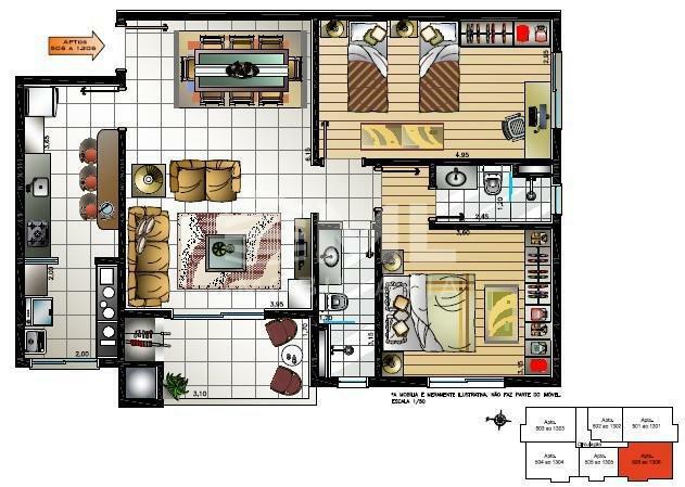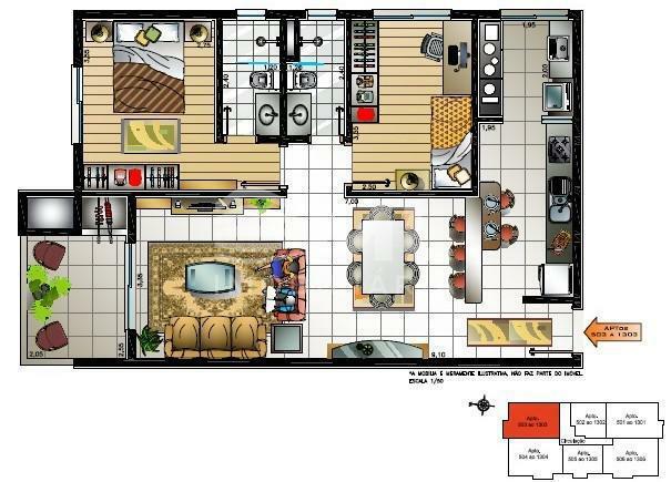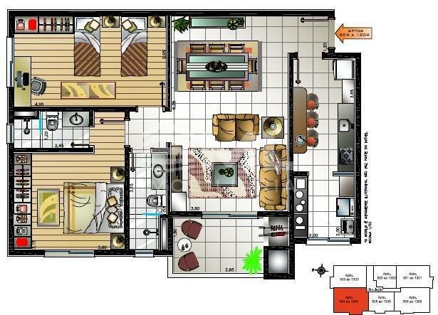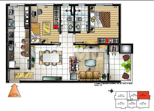 Apartamento 02 dormitórios,(82,89 privativos) sendo uma suíte, com sala 02 ambientes, sacada com churrasqueira, cozinha, área de serviço, banheiro social.
