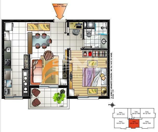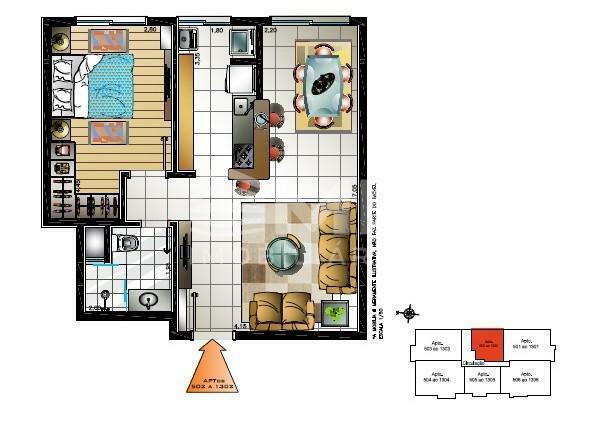 Apartamento de 01 dormitório,(51,51 privativos) com sala 02 ambientes, sacada com churrasqueira, cozinha, área de serviço, banheiro social.