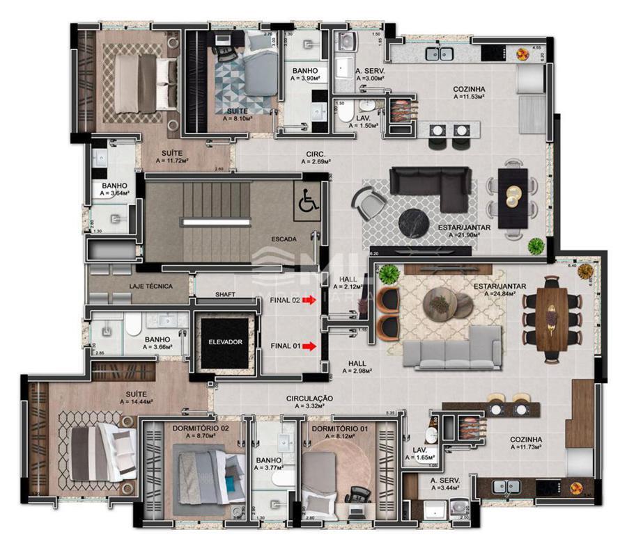 Apartamento com duas suítes, lavabo, cozinha americana com churrasqueira, lavanderia separada, sala 2 ambientes com linda vista.