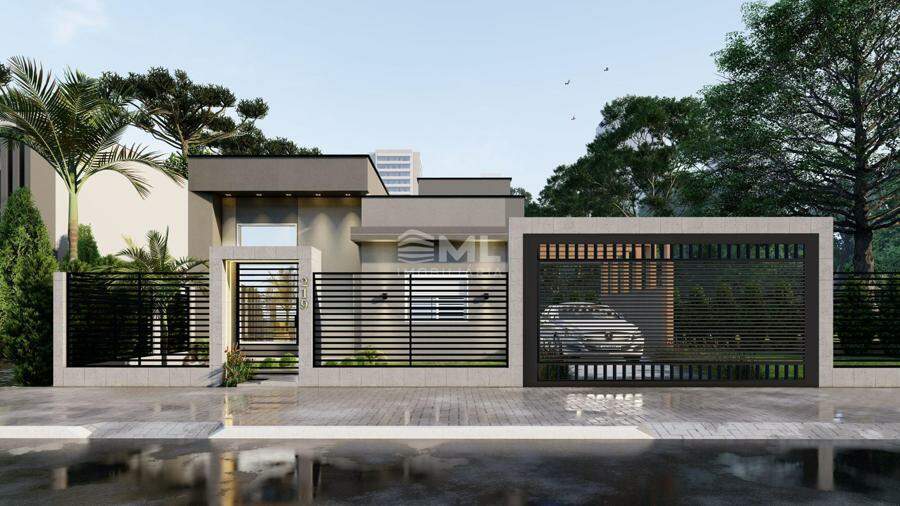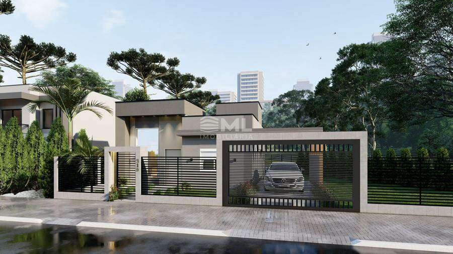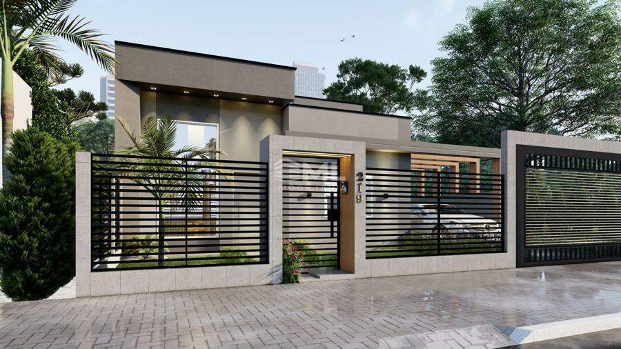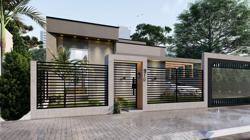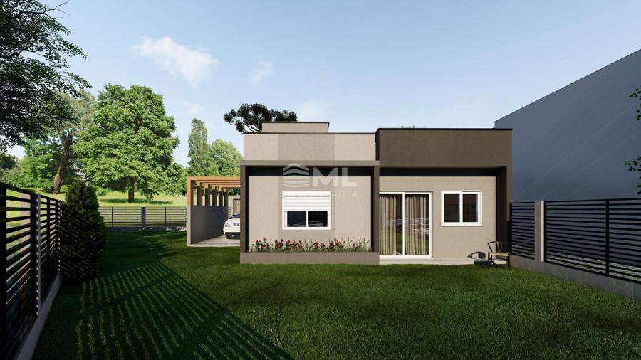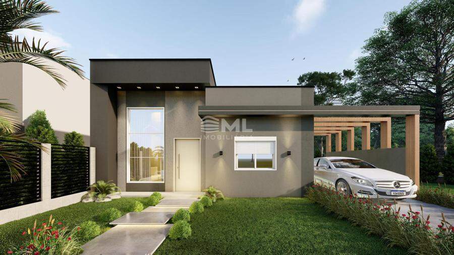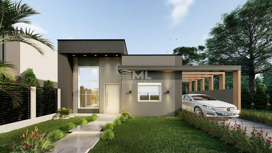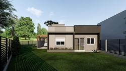 Casa térrea com cozinha, sala de estar e jantar integrados, dois dormitórios sendo uma suíte e um banheiro social. Garagem coberta por pergolado para um carro.