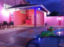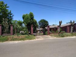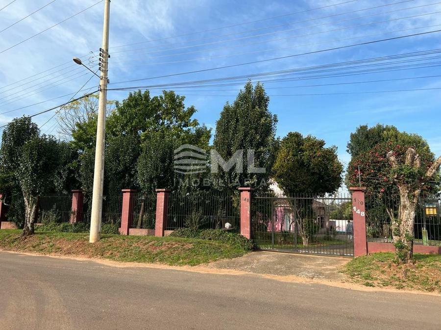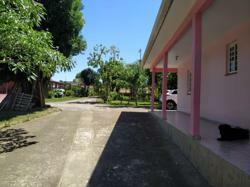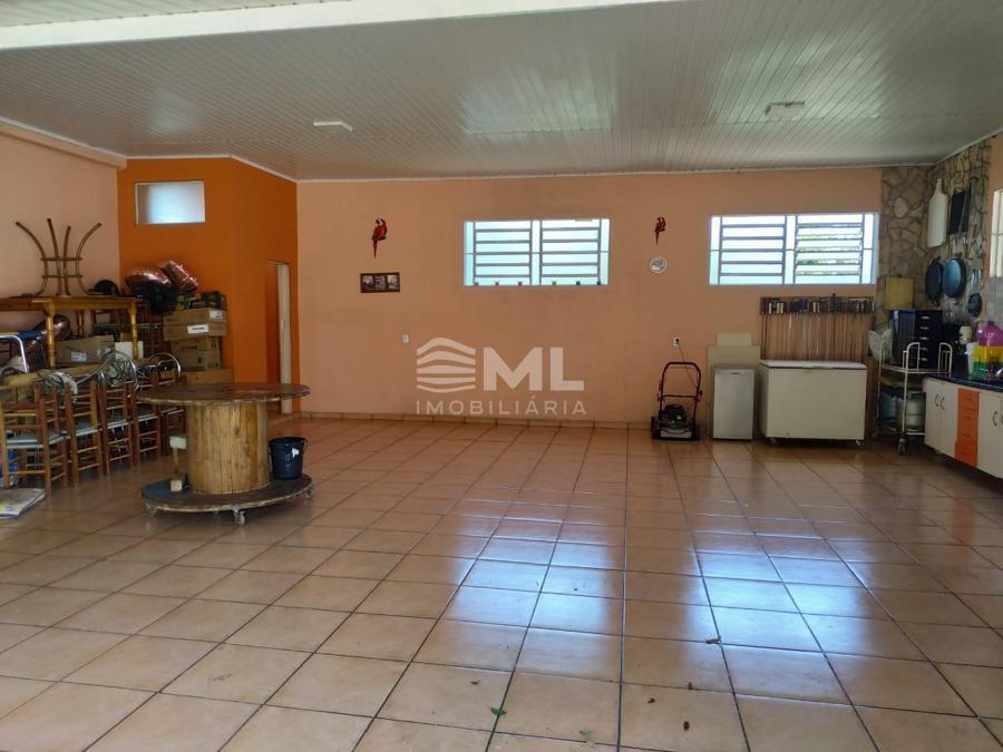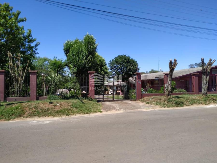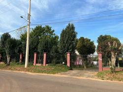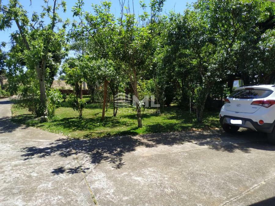 Terreno com 1057.50m² contendo casa em alvenaria de dois pisos, com três quartos, amplo pátio arborizado e salão de festas com piscina.