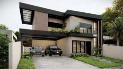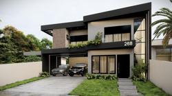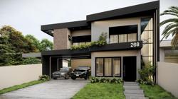 Living integrado com sala de estar, jantar e cozinha, um lavabo e lavanderia, além de garagem para dois veículos na parte do pavimento térreo. Já no pavimento Superior, a planta possui 3 suítes, sendo as da frente da casa com sacada.
