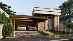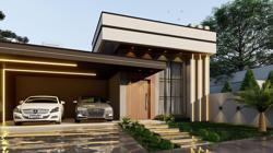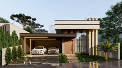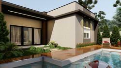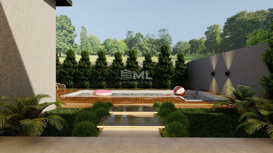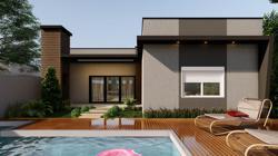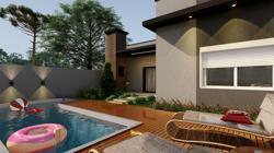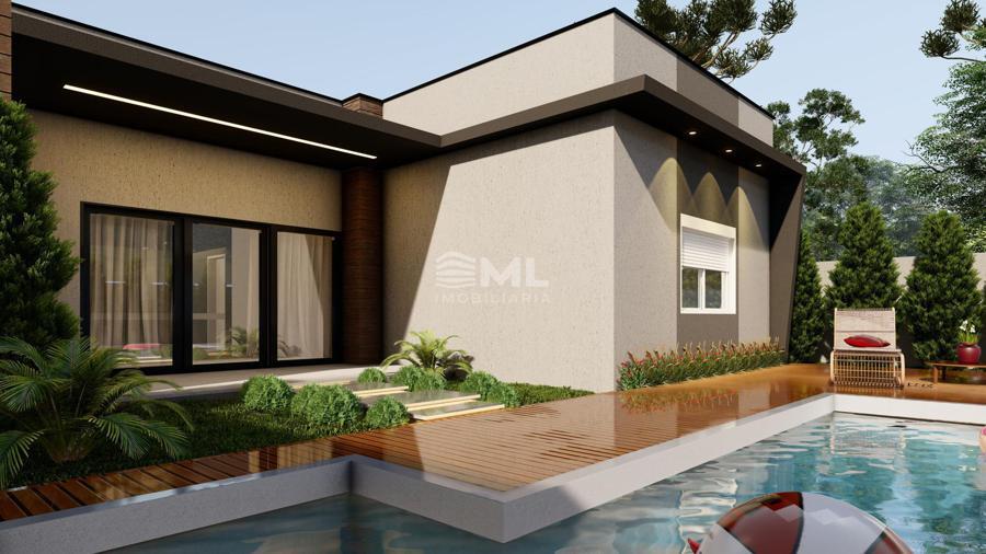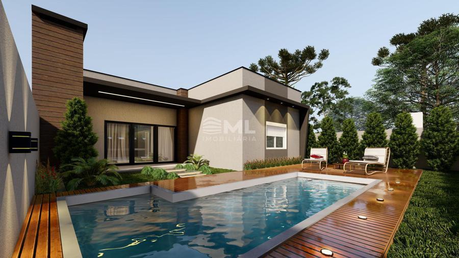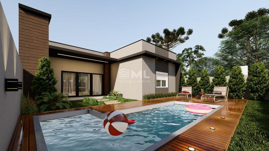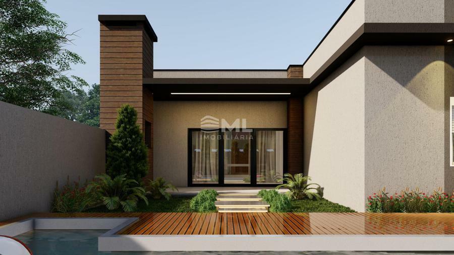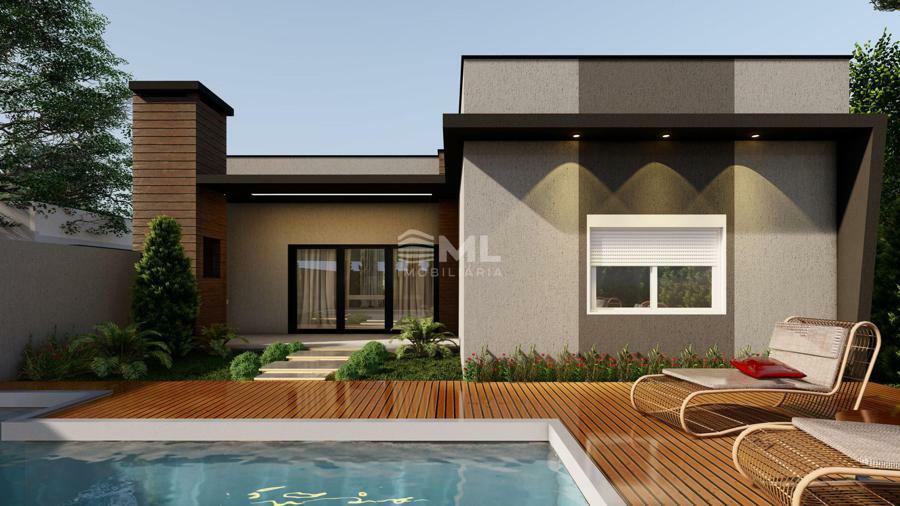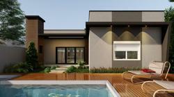 Casa térrea com cozinha, sala de estar e jantar integrados, três dormitórios, sendo uma suíte e um banheiro social. Garagem coberta para um carro. Área gourmet com acesso à piscina.