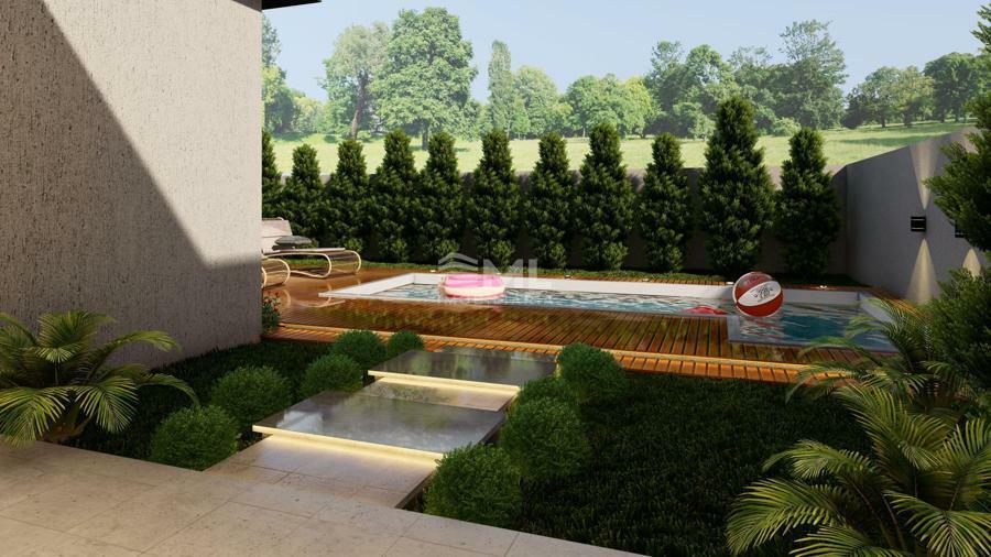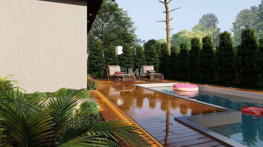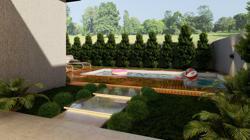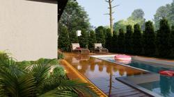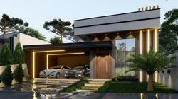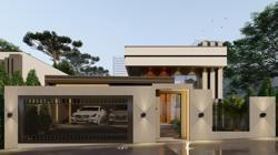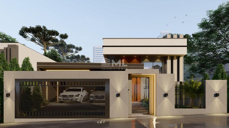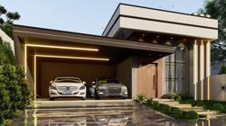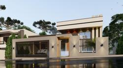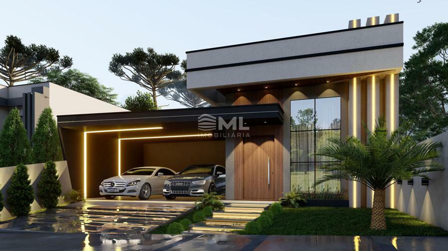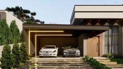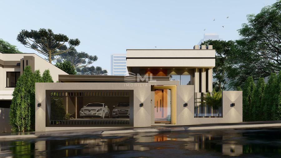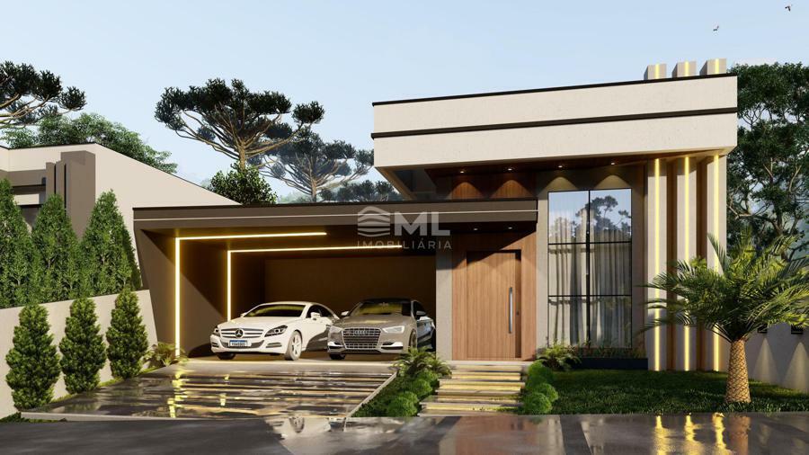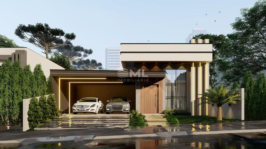 Casa térrea com cozinha, sala de estar e jantar integrados, três dormitórios, sendo uma suíte e um banheiro social. Garagem coberta para um carro. Área gourmet com acesso à piscina.