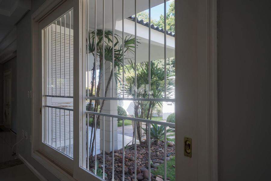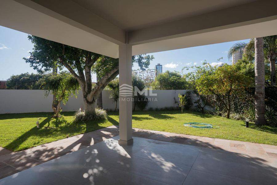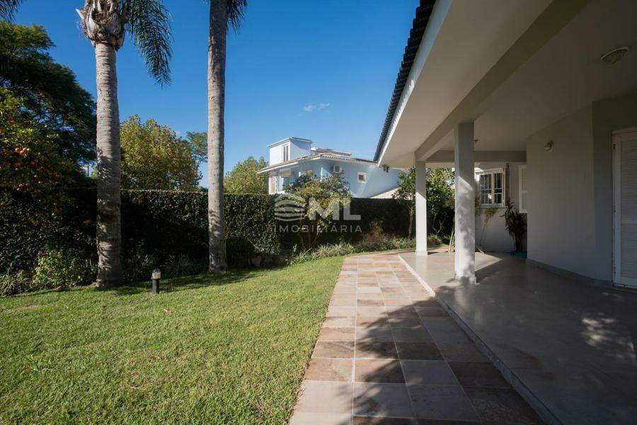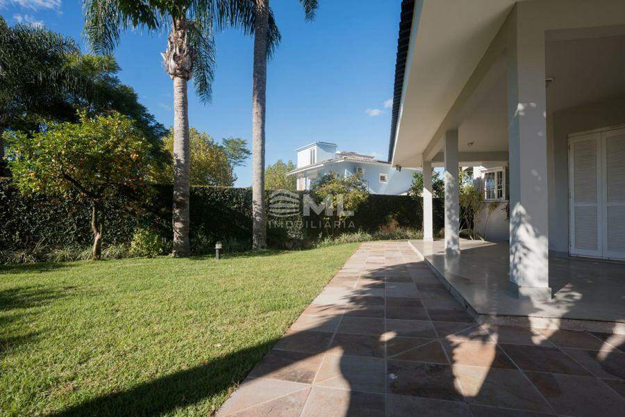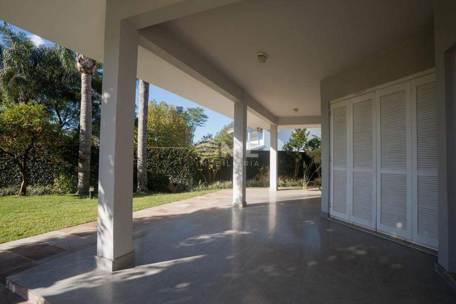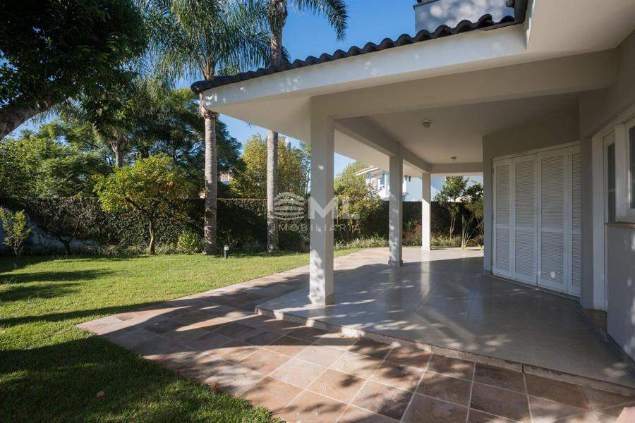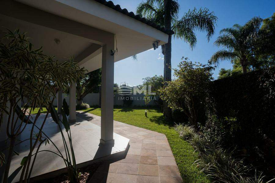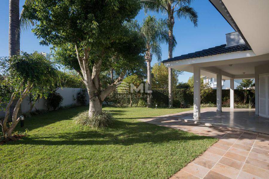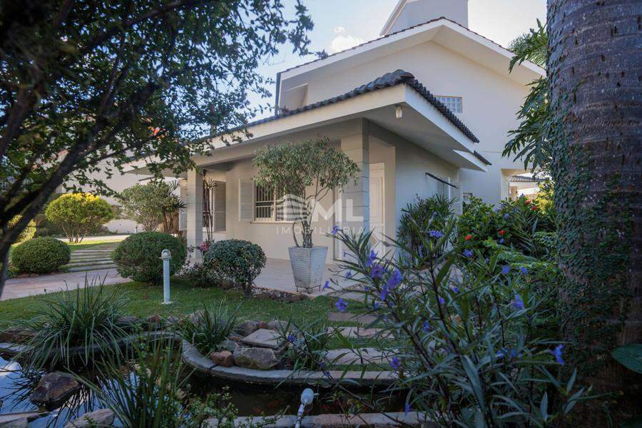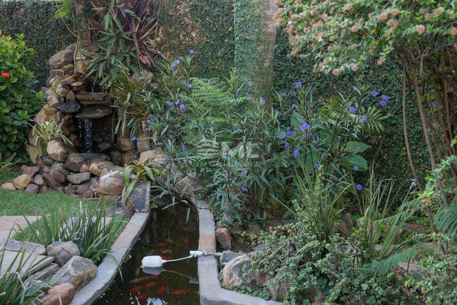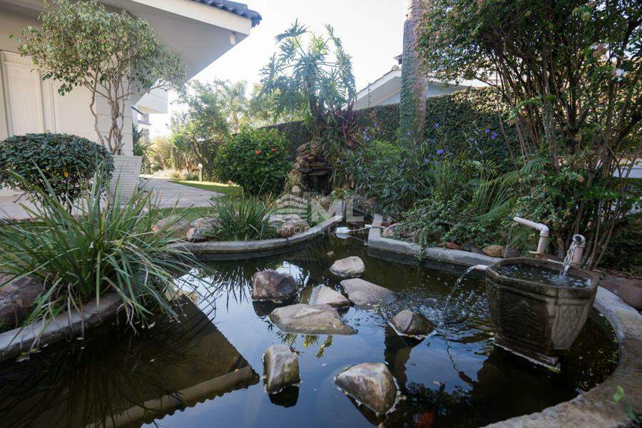 A área externa é um dos grandes destaques da residência, composta por jardins arborizados que emolduram o terreno e proporcionam uma atmosfera de tranquilidade e contato com a natureza. Um lago ornamental com cascata confere charme e sofisticação ao paisagismo, criando um ambiente ideal para relaxamento. O espaço ainda conta com amplo potencial para a instalação de piscina e áreas de lazer complementares, valorizando ainda mais o uso do espaço ao ar livre.