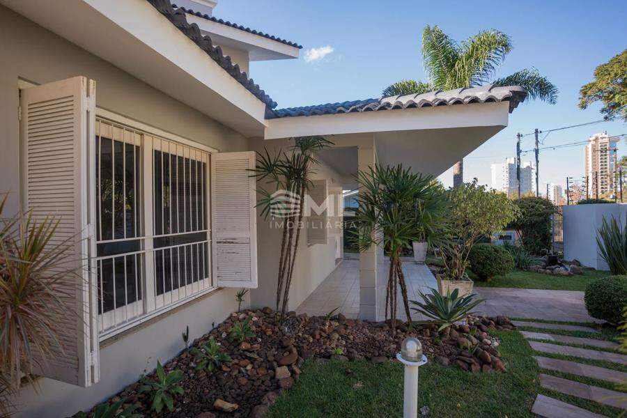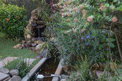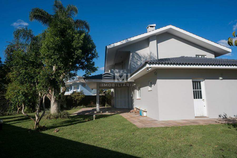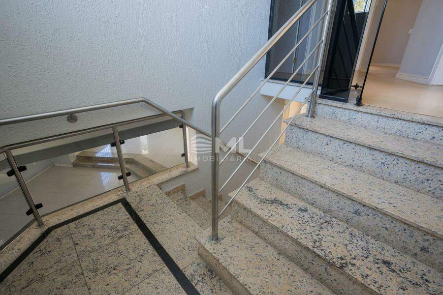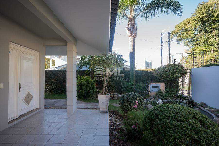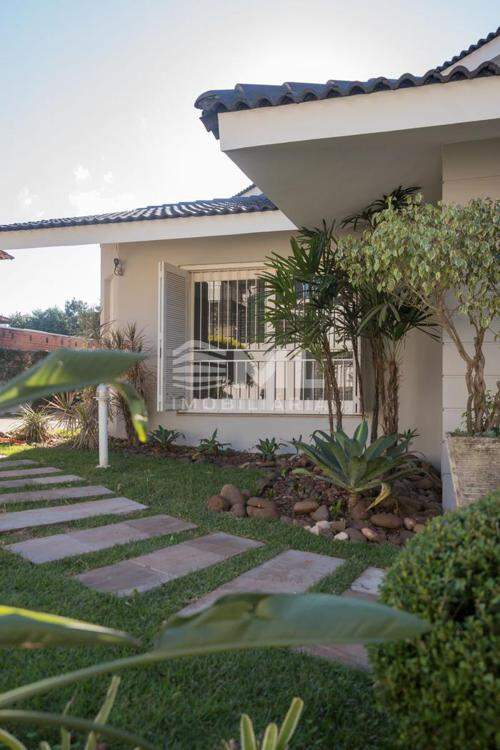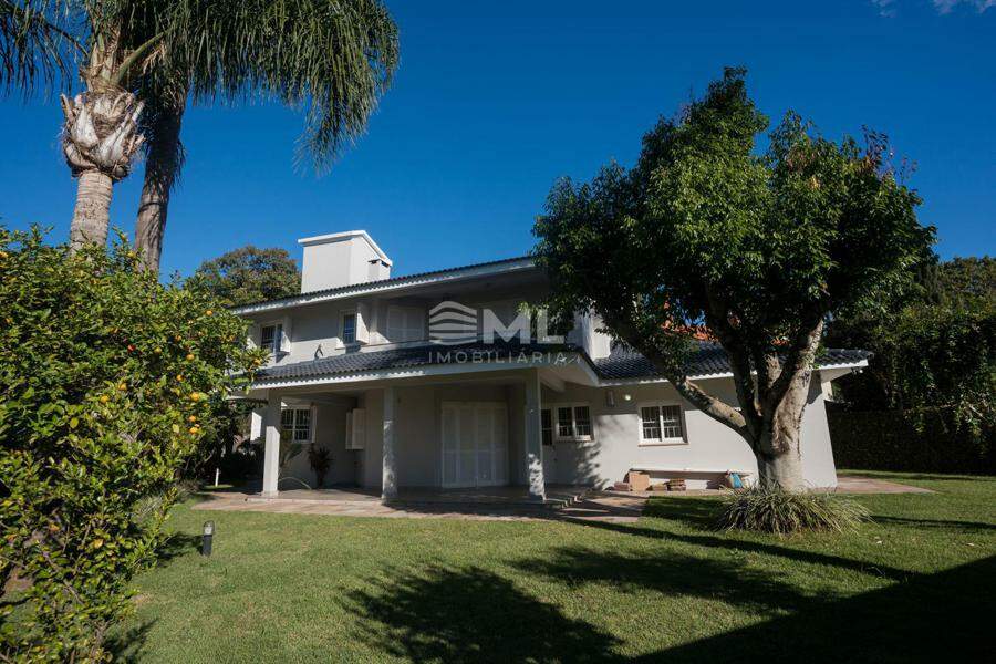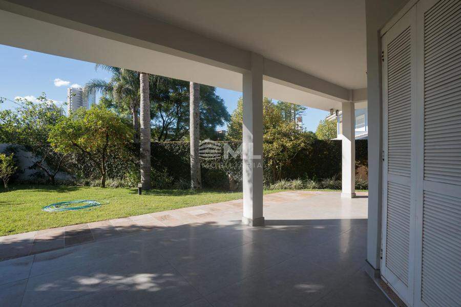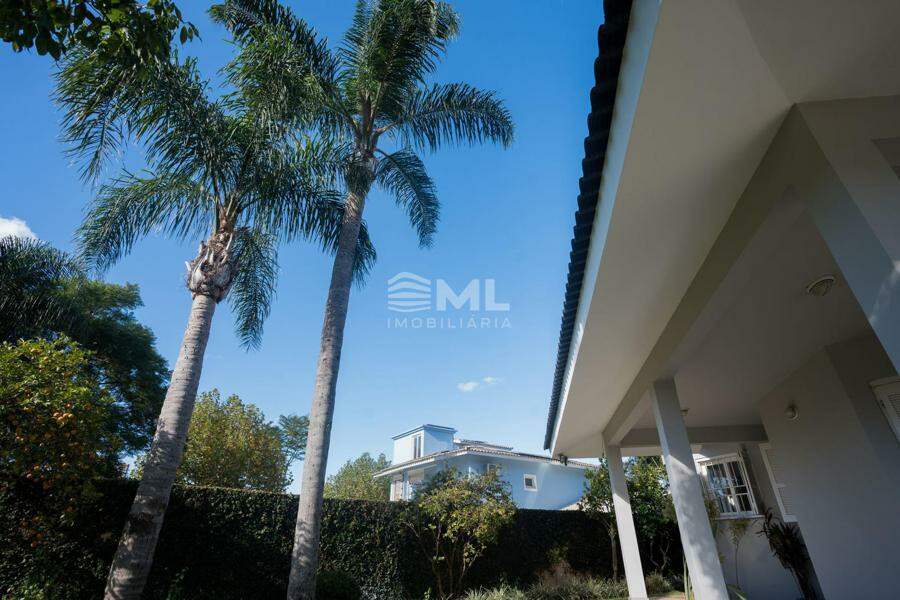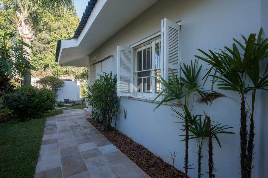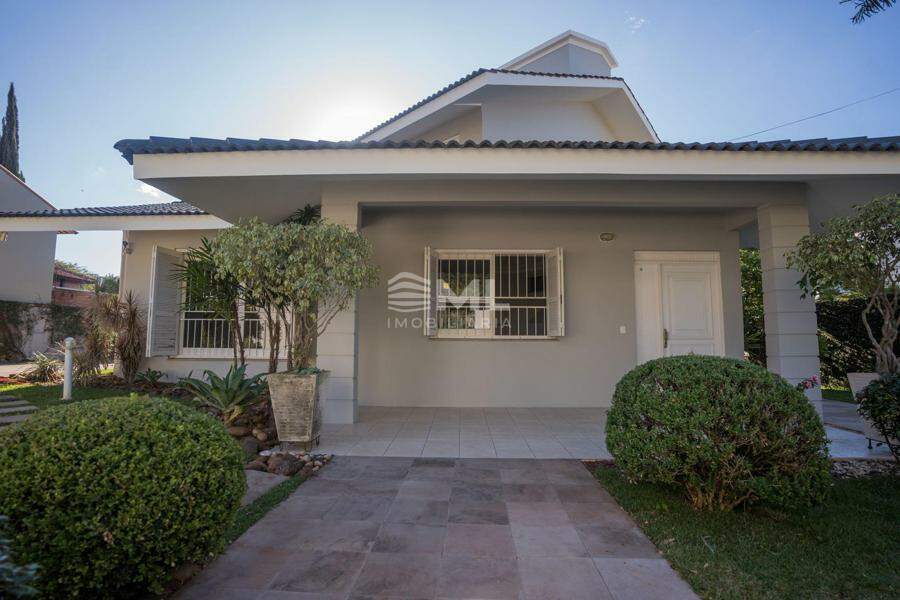 A área externa é um dos grandes destaques da residência, composta por jardins arborizados que emolduram o terreno e proporcionam uma atmosfera de tranquilidade e contato com a natureza. Um lago ornamental com cascata confere charme e sofisticação ao paisagismo, criando um ambiente ideal para relaxamento. O espaço ainda conta com amplo potencial para a instalação de piscina e áreas de lazer complementares, valorizando ainda mais o uso do espaço ao ar livre.